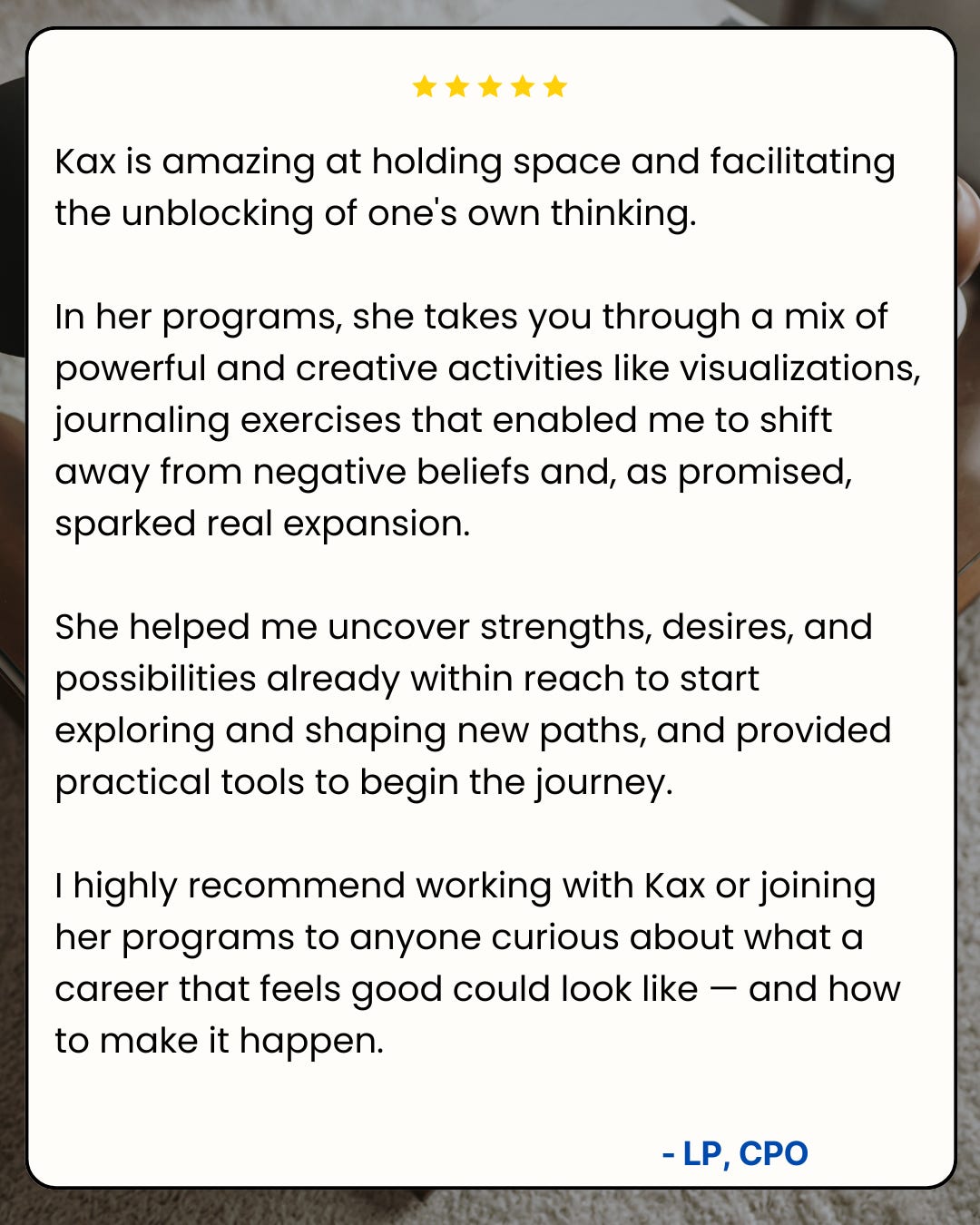 Why I coach: I believe that if there are more and more people prioritize their wellbeing, choose career moves that are in alignment with their values and ambition, and help others do the same — then we can change how this industry operates and make it more kind, human, and in service of the people (and not just the investors).